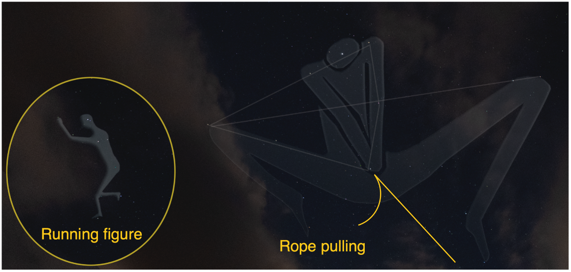 Actually, it was relatively easy. Anyone can do it, given clear night skies and a clear idea of what defines any given object. Defining points do just what they say, they define what it is you are looking at. A human, for example, needs a head (one star, preferably a bright one), two shoulders (two stars, preferably fainter than the head, located in the appropriate position) and limbs, defined by, but not necessarily including; elbows, hands, bum, knees and feet. The position of these stars determines what the human is doing. Here are two human figures in different poses: