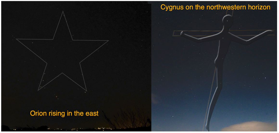While this Star of Stars heralds the birth of Jesus, the image behind his traditional demise occurs in the northwest, as Cygnus sinks towards the horizon.