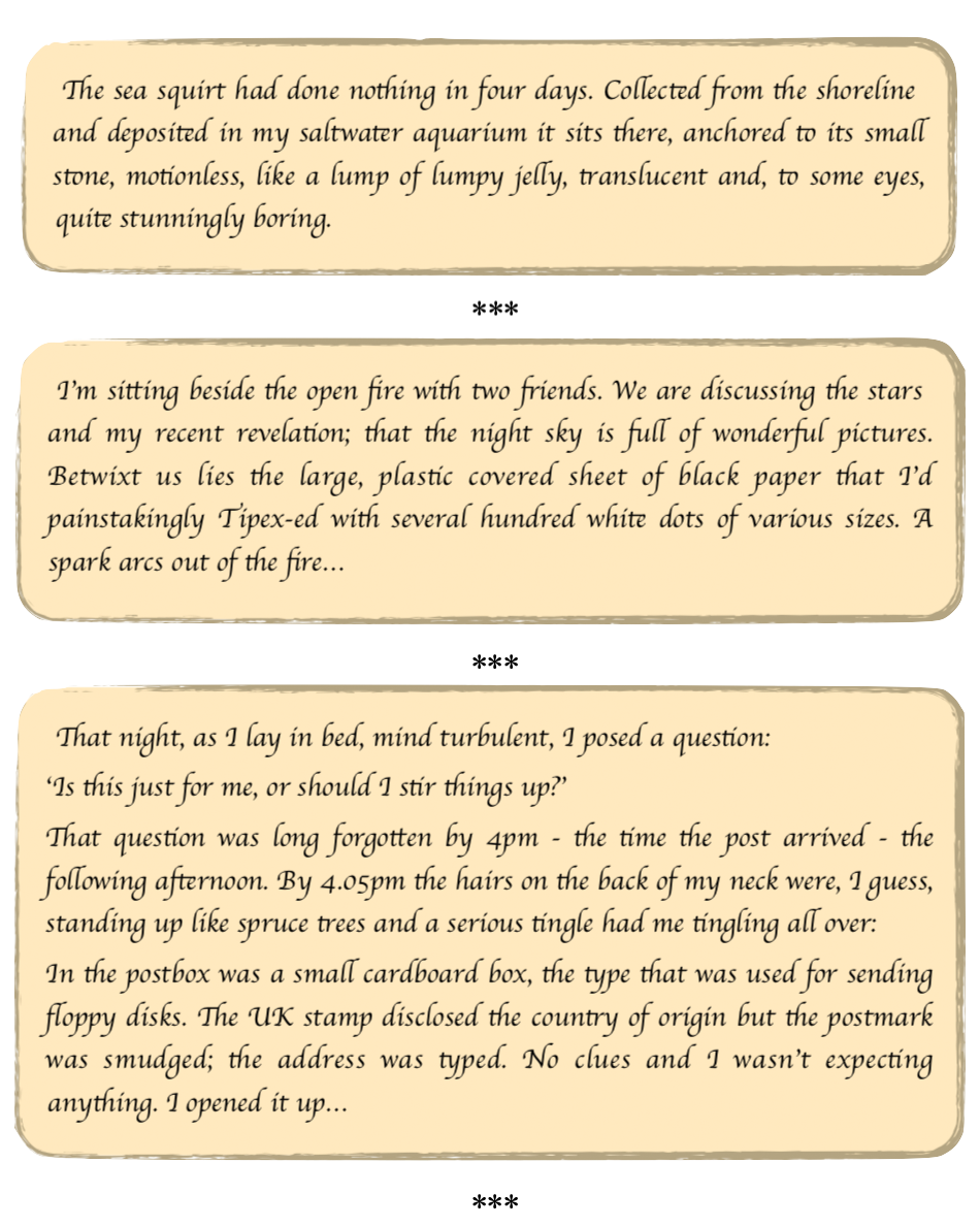 One day I visited Georg in his tiny tin house, an hour's cycle ride away. It must have been a nice day but the only thing I remember was him showing me a page in the Collins Gem ‘Night Sky’ book; ‘This is the story of Adam and Eve’ he said. Now, my life didn’t change in that instant, not really my thing at the time, stars and Bible stories. It took a three day flu, two weeks later, for ideas to start formatting themselves in my brain and thus, amid the hot sweats and cold of a clammy bed, it began. Relentlessly. Stories in the stars. Mythological star stories. Mythological, arty pictures amid the constellations. Mythological stories from pictures in the stars. Got it!