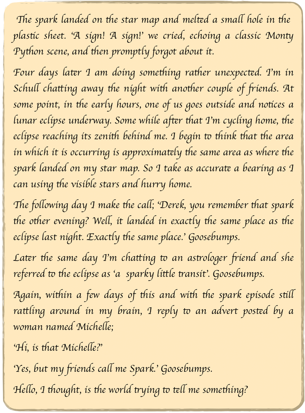 The episode with the spark had opened my mind to the possibility of external help. At first I referred to this help as The Arrangers for that is what appeared to happen, arrangements were made, which is how I came to understand the nature of the Star of Bethlehem.