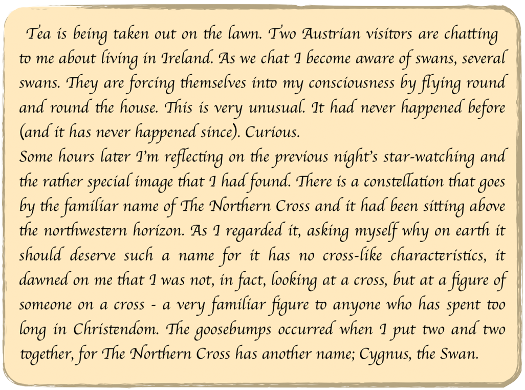 Maybe not, for there is a curiosity that needs addressing and it is this: in the New Testament story Jesus is taken to a place called Golgotha for his execution (see The Crux in Star Strike). Golgotha is not a place on Earth but an area of stars which today goes by the name of Cygnus. Within Cygnus can be found the image (a skull) behind the meaning of the word Golgotha; Place of the Skull, and in Schull/Skull there is, as mentioned before, a fifty-seater Planetarium which, at any time of day or night, rain or shine, can show this execution once again.