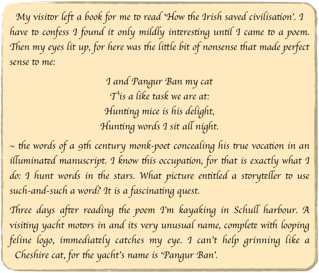 As my quest to find and understand the pictures of the night unfolded, so I became aware of an Unofficial History, found throughout human culture. Pangur Ban is a purrrfect example, for the poet-monk tells us what we really need to know; that the night is full of words and that he (and his kind, presumably) were seeking them.