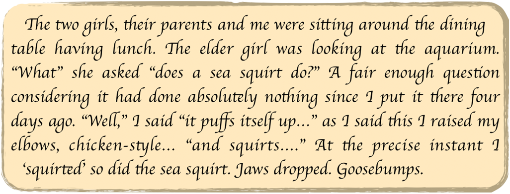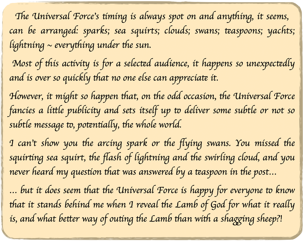 Unlike past and present gods the Universal Force has no back story, nothing for we humans to argue and fight over. What it does have, though, is an infinite number of individual stories, ones like the shagging sheep and squirting sea squirt. Maybe it is time to start sharing such stories, for the more we tell the more we encourage others to recognise their own real-life ‘miracle’ stories. These stories-of-the-senses (as opposed to the non-sense stories of belief) can unite us, for although they are unique to each and everyone of us they are also common to all... and they are great FUN!!